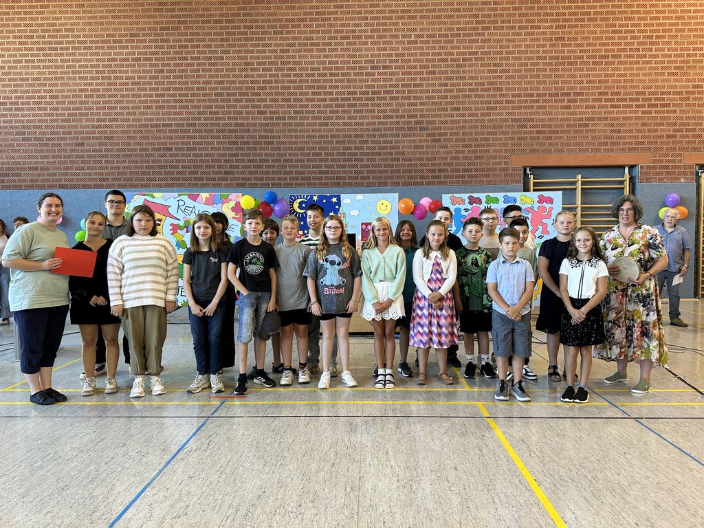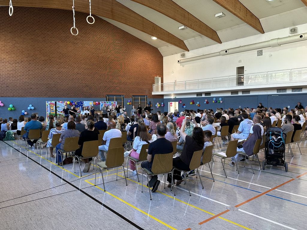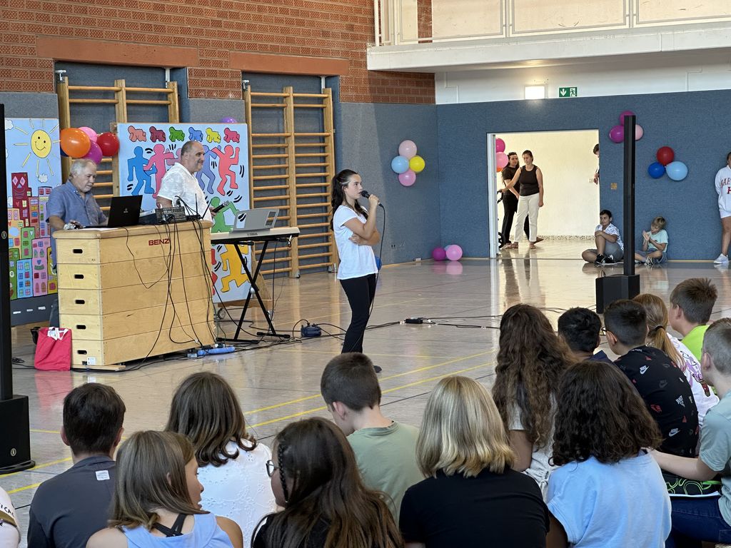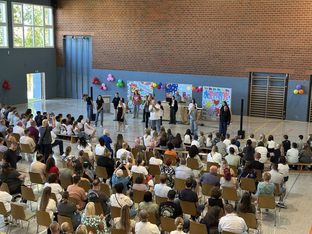 Nun folgte die lang ersehnte Klasseneinteilung. Die neuen Fünftklässler lernten ihre Klassenlehrerinnen Frau Jost und Fr. Wichmann (5a), Frau Schmitt (5b), Herr Sensbach (5c) und Frau Ziemann (5d) kennen und auch ihre Paten aus dem 10. Schuljahr, die sie die kommenden Wochen begleiten und unterstützen werden. Die Sechstklässlerin Fabienne Schwarz beendete mit einem tollen Liedbeitrag die gelungene Veranstaltung, ehe die neuen Kinder ihre Klassenräume besichtigen durften.