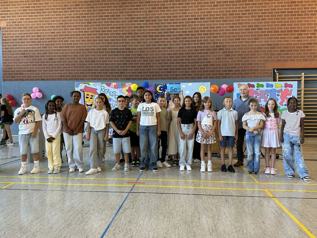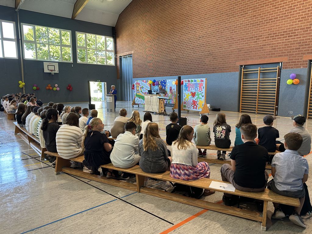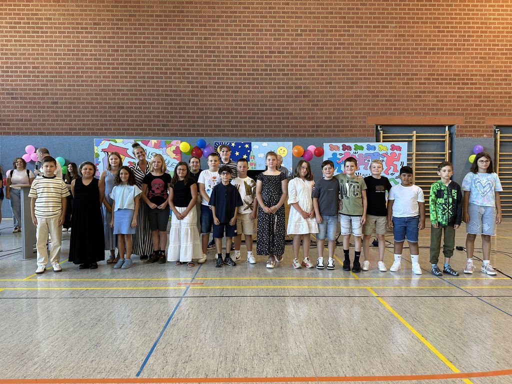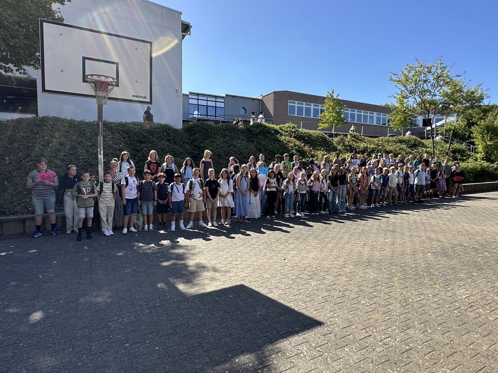 Nun folgte die lang ersehnte Klasseneinteilung. Die neuen Fünftklässler lernten ihre Klassenlehrerinnen Frau Jost und Fr. Wichmann (5a), Frau Schmitt (5b), Herr Sensbach (5c) und Frau Ziemann (5d) kennen und auch ihre Paten aus dem 10. Schuljahr, die sie die kommenden Wochen begleiten und unterstützen werden. Die Sechstklässlerin Fabienne Schwarz beendete mit einem tollen Liedbeitrag die gelungene Veranstaltung, ehe die neuen Kinder ihre Klassenräume besichtigen durften.