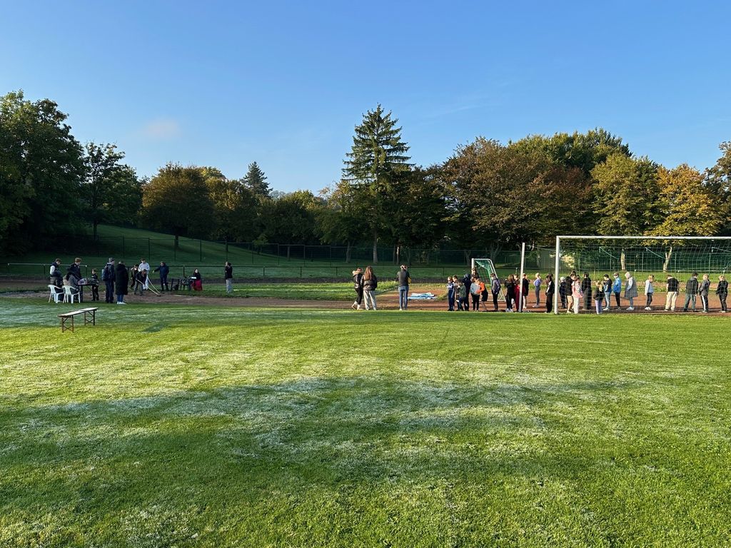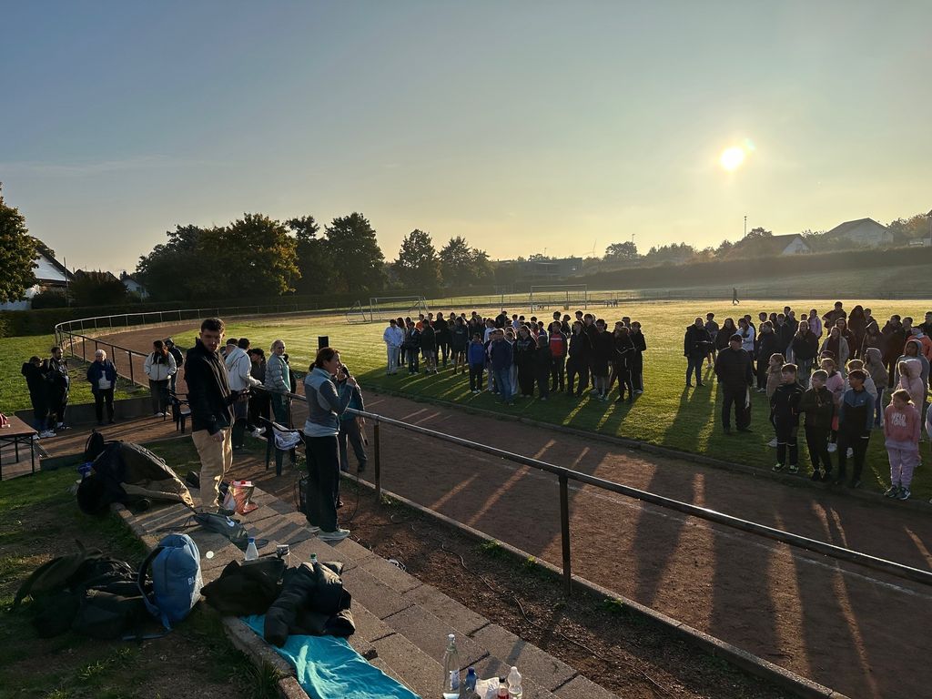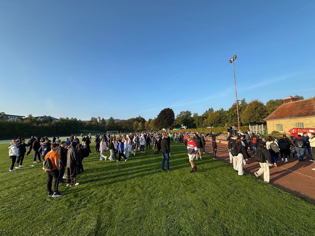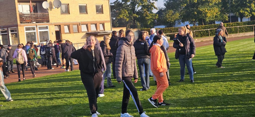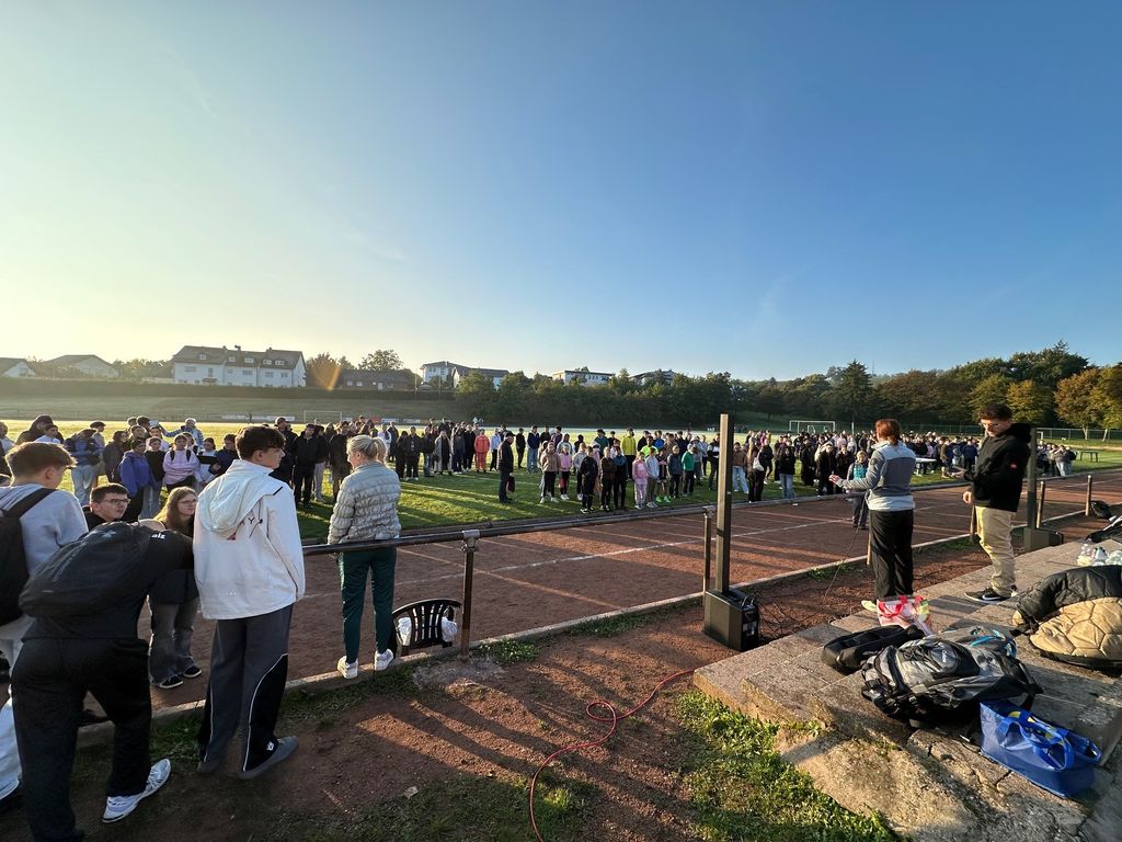Bei morgens doch recht frischen Temperaturen stellten Frau Ritter, Frau Kusserow und Herr Weber im Namen der Sportfachschaft die Planung und den Ablauf des heutigen Tages der versammelten Schulgemeinschaft im Wöllsteiner Stadion vor.
