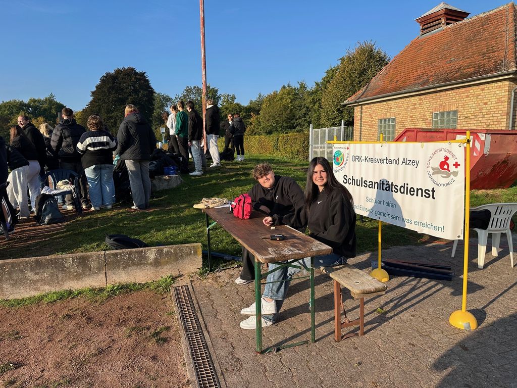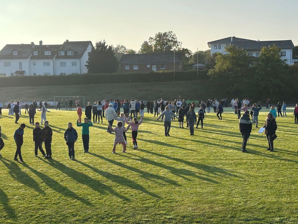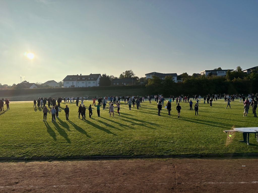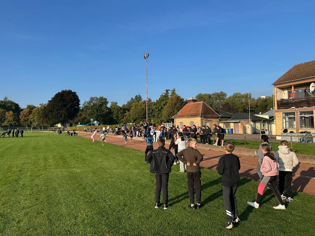 Konrektor Herr Beuscher begrüßte alle Sportlerinnen und Sportler, motivierte diese für den sportlichen Vormittag und bedankte sich beim Schulsanitätsdienst für dessen Unterstützung. Danach führten die Schülersprecher Marcel Kehl und John Becker ein musikalisches Warm-up für alle anwesenden Klassen durch.