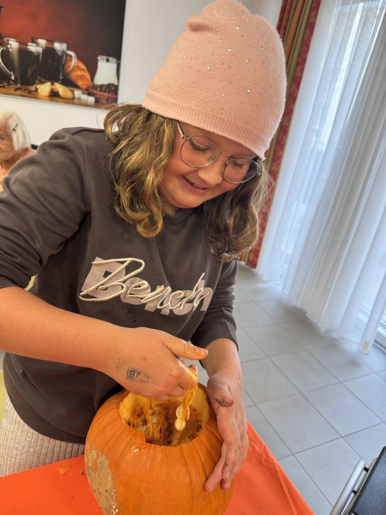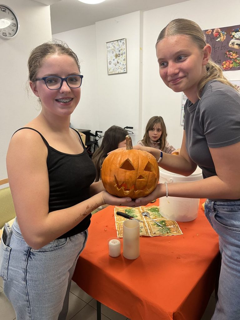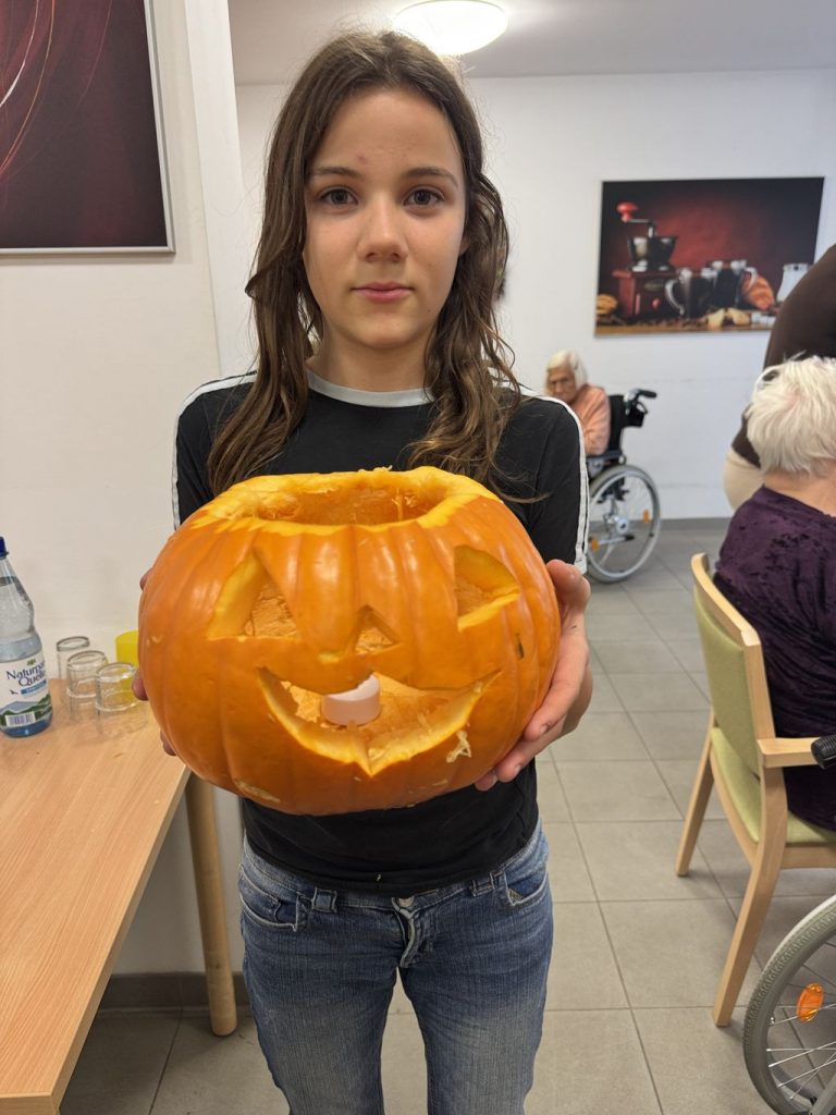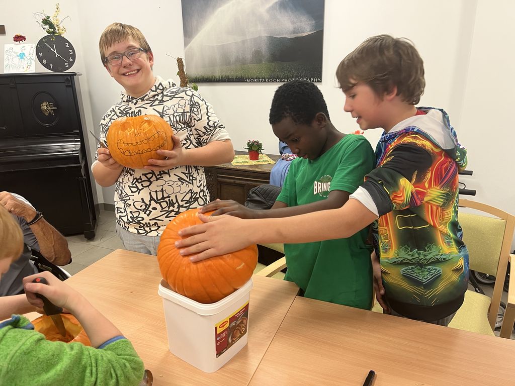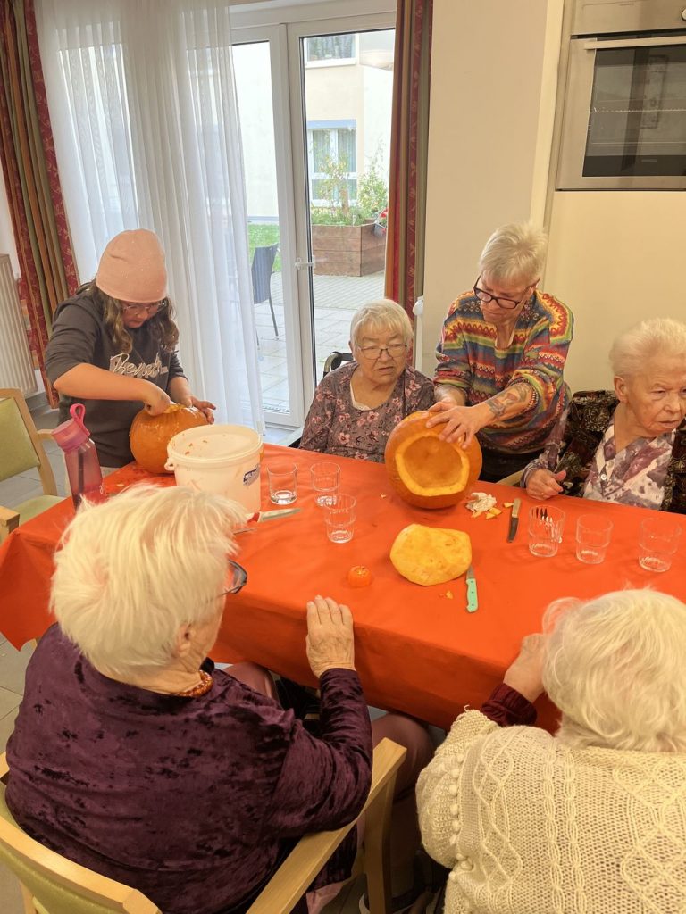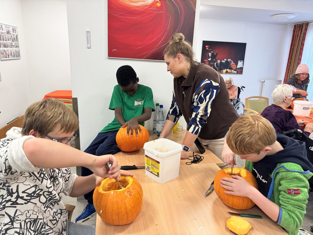 Gemeinsam in Kleingruppen schnitzten die Generationen zehn Kürbisse, von denen einige vor den Türen des Seniorenheims leuchten und andere den Halloween-Aktionstag in der Schule bereicherten.