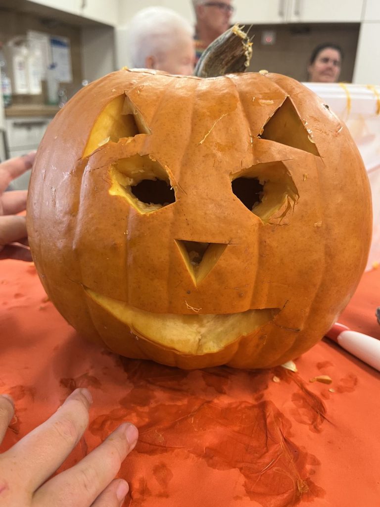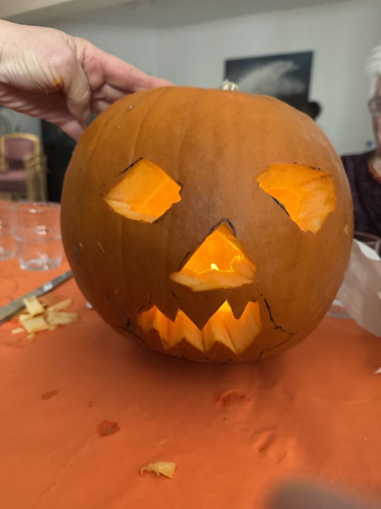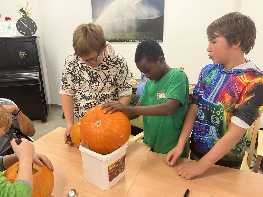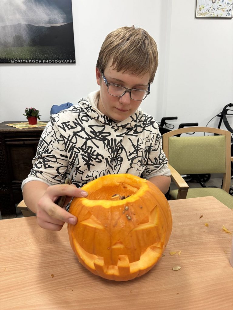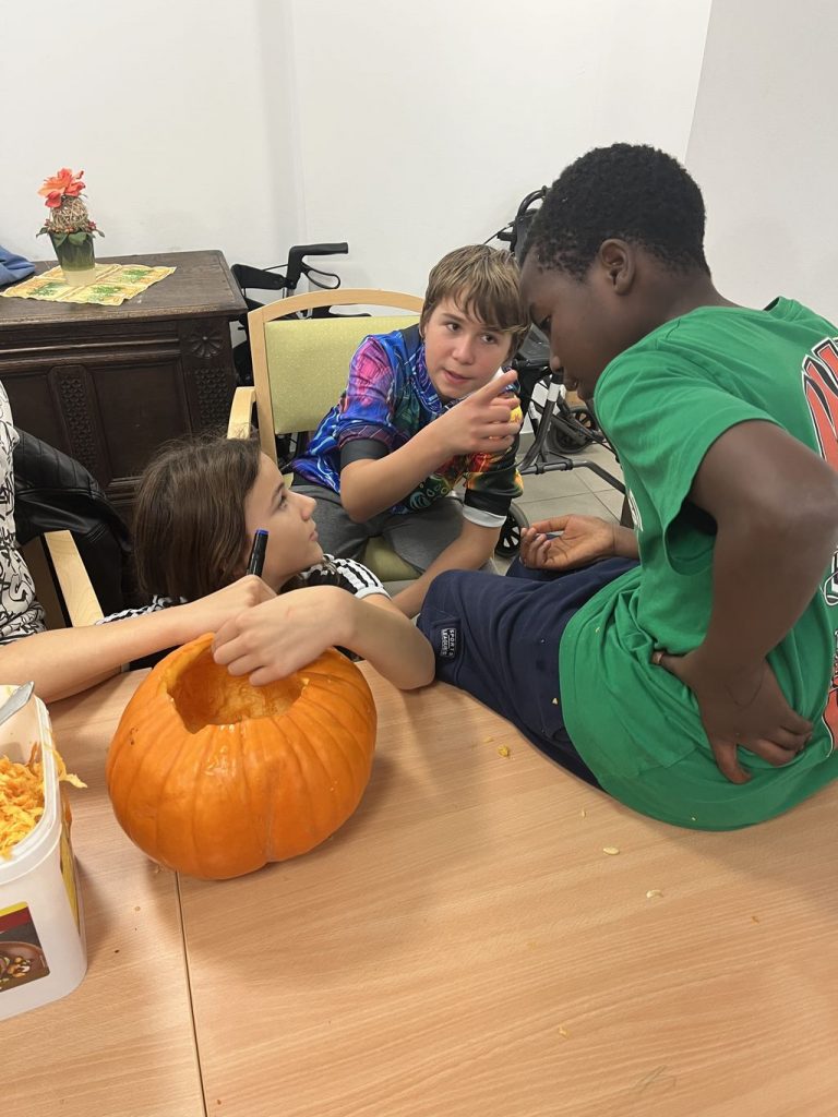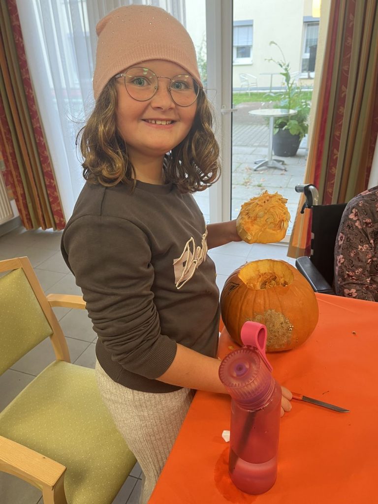Gemeinsam in Kleingruppen schnitzten die Generationen zehn Kürbisse, von denen einige vor den Türen des Seniorenheims leuchten und andere den Halloween-Aktionstag in der Schule bereicherten.