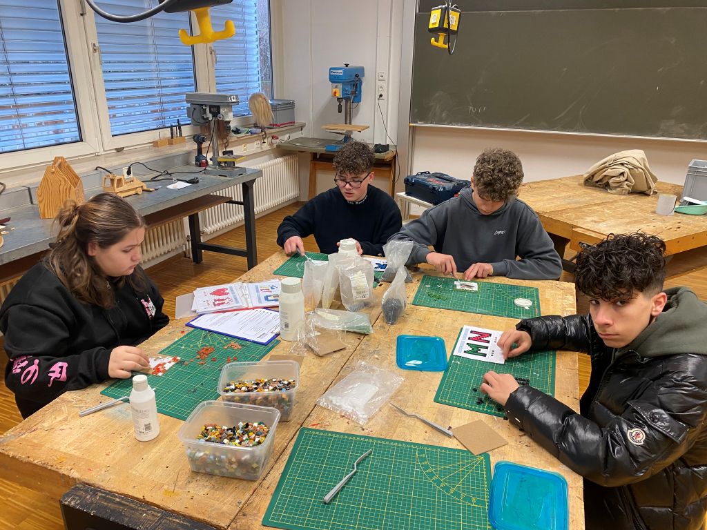 Zu Beginn erfolgte eine kurze Einführungsphase durch Herrn Löwe von der Handwerkskammer Rheinhessen, in der gemeinsam erarbeitet wurde, was unter dem Begriff Handwerkskammer (HWK) zu verstehen ist und welche Aufgaben sie erfüllt. Im Anschluss arbeiteten die Lernenden an insgesamt fünf Stationen, die sie im Laufe des Vormittags durchliefen. Sie stellten einen Handyhalter aus Holz her, fertigten eine Metallblume an, arbeiteten an einer Schmuckstation, gestalteten ein Mosaik und übten sich an der Frisuren-Station mit Perücken.