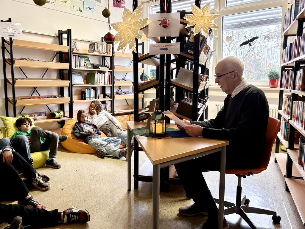 Die Klasse 5d hörte eine Geschichte von dem Stern „Blinky“, die der ehemalige Konrektor Helmut Degen vortrug. Bernd Antweiler, ehemaliger Schulleiter, hatte eine Kurzgeschichte über den unordentlichen Georg und seine zwei braven Schwestern, die Besuch vom Nikolaus bekommen, im Gepäck.
