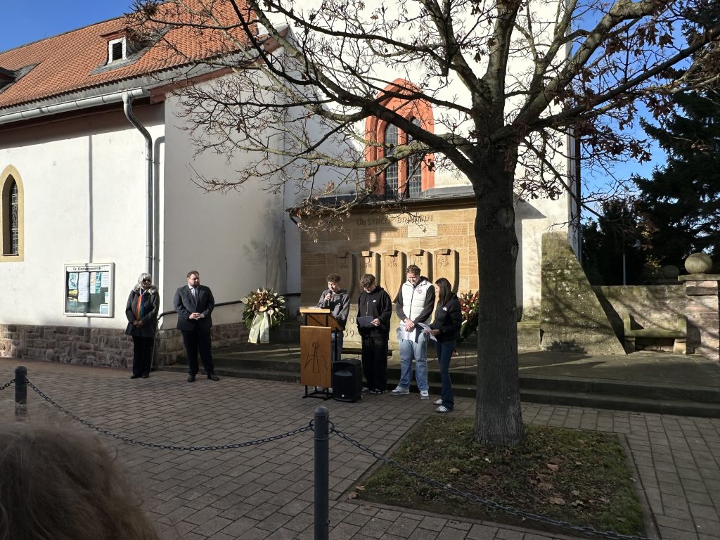 Nach Reden von Ortsbürgermeister Brüchert, Pfarrer Hantsch, Frau Müller (VdK) sowie musikalischer Begleitung von dem katholischen Kirchenchor „Cäcilia“ und Musikbeiträgen von der Trompeterin Annalena Strobel lasen unsere vier Schülerinnen und Schüler (Vivien, Anton, Marcel und John, alle 10. Schuljahr) abwechselnd einen nachdenklichen Friedenstext vor der Kirche vor. Unterstützt wurden sie von Klassenlehrer Tobias Röhlich.