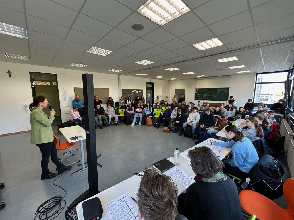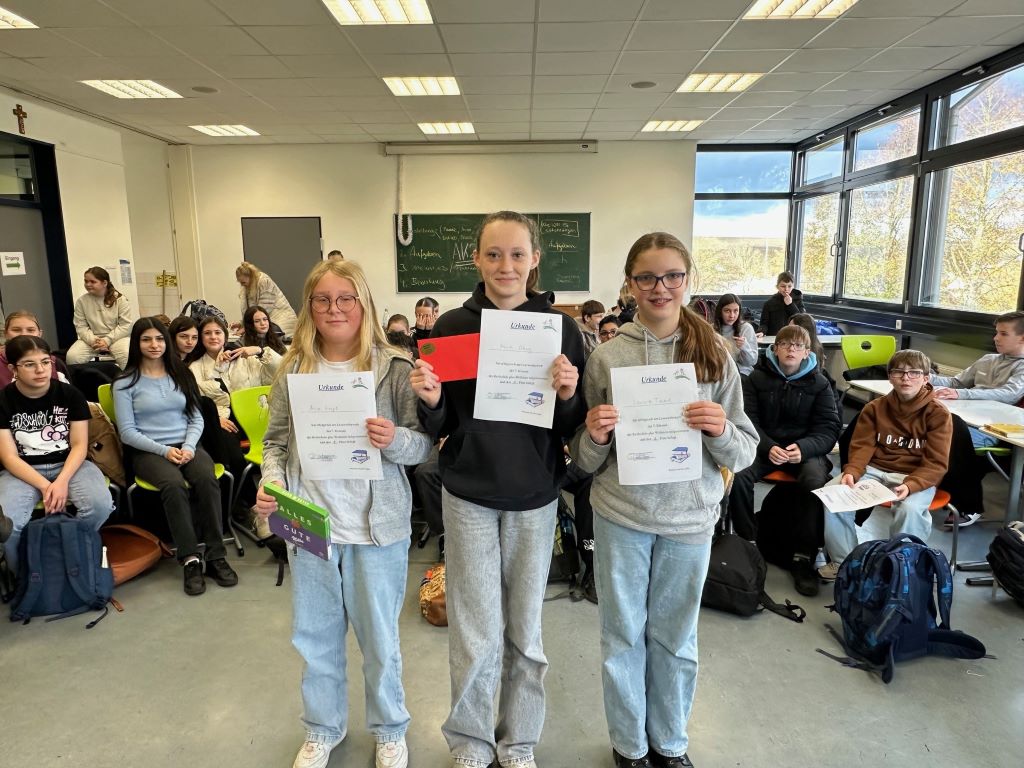 Die drei siebten Klassen mit ihren Klassenleitungen Frau Stangenberg (7a), Herrn Braun (7b) und Herrn Weingärtner (7c) versammelten sich am 20.11.2024 in der 5. und 6. Stunde im Mehrzweckraum der Realschule plus Wöllstein. Aus jeder Klasse nahmen zwei sehr gute Leserinnen und Leser am Wettbewerb teil. Zuvor wurde natürlich im Deutschunterricht besprochen, was gutes Lesen ausmacht und es gab Gelegenheit zum Üben. Eine vierköpfige Jury saß bereit: Herr Beuscher (stellvertretender Schulleiter), Frau Jost (unabhängige Deutschlehrerin), Diana Schneider (Schülersprecherin) und der Sieger aus dem letzten Jahr, Dominic Albert. Es ging los: Zuerst lasen die Schülerinnen und Schüler einen selbst ausgewählten und geübten Text circa drei Minuten vor. Anschließend gab es einen unbekannten Text und alle mussten ihre Lesekompetenz zeigen. Die Klassenkameradinnen und Kameraden hörten aufmerksam zu und applaudierten den Kandidatinnen und Kandidaten. Dann ging die Jury in die Beratung. Alle Leserinnen und Leser gaben ihr Bestes, überwunden ihre Nervosität und waren überzeugend. Doch den Siegertitel für ihre hervorragende Lesevorstellung erhielt Mira Schug aus der Klasse 7c. Ihre Klassenkameradin Leonie Tremel (7c) belegte einen exzellenten zweiten Platz, dicht gefolgt von Mia Voigt (7b) mit dem dritten Platz.